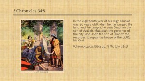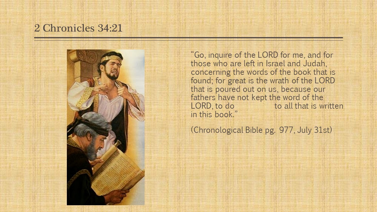 “Go, inquire of the LORD for me, and for those who are left in Israel and Judah, concerning the words of the book that is found; for great is the wrath of the LORD that is poured out on us, because our fathers have not kept the word of the LORD, to do according to all that is written in this book.” (Chronological Bible pg. 977, July 31st)
