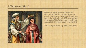 Josiah was eight years old when he became king, and he reigned thirty-one years in Jerusalem.   And he did what was right in the sight of the LORD, and walked in the ways of his father David; he did not turn aside to the right hand or to the left. (Chronological Bible, pg. 960, July 29th)