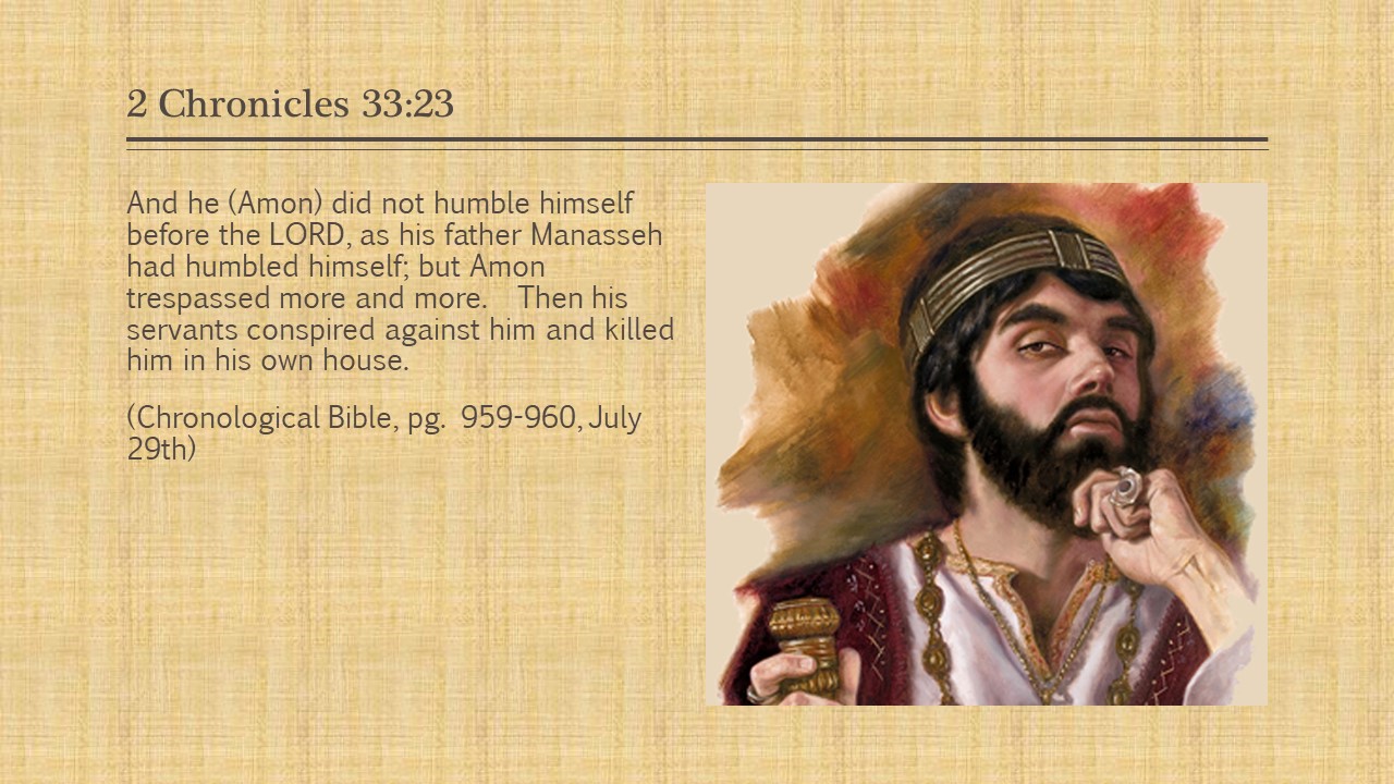 And he (Amon) did not humble himself before the LORD, as his father Manasseh had humbled himself; but Amon trespassed more and more. Then his servants conspired against him and killed him in his own house.   (Chronological Bible, pg. 959-960, July 29th)