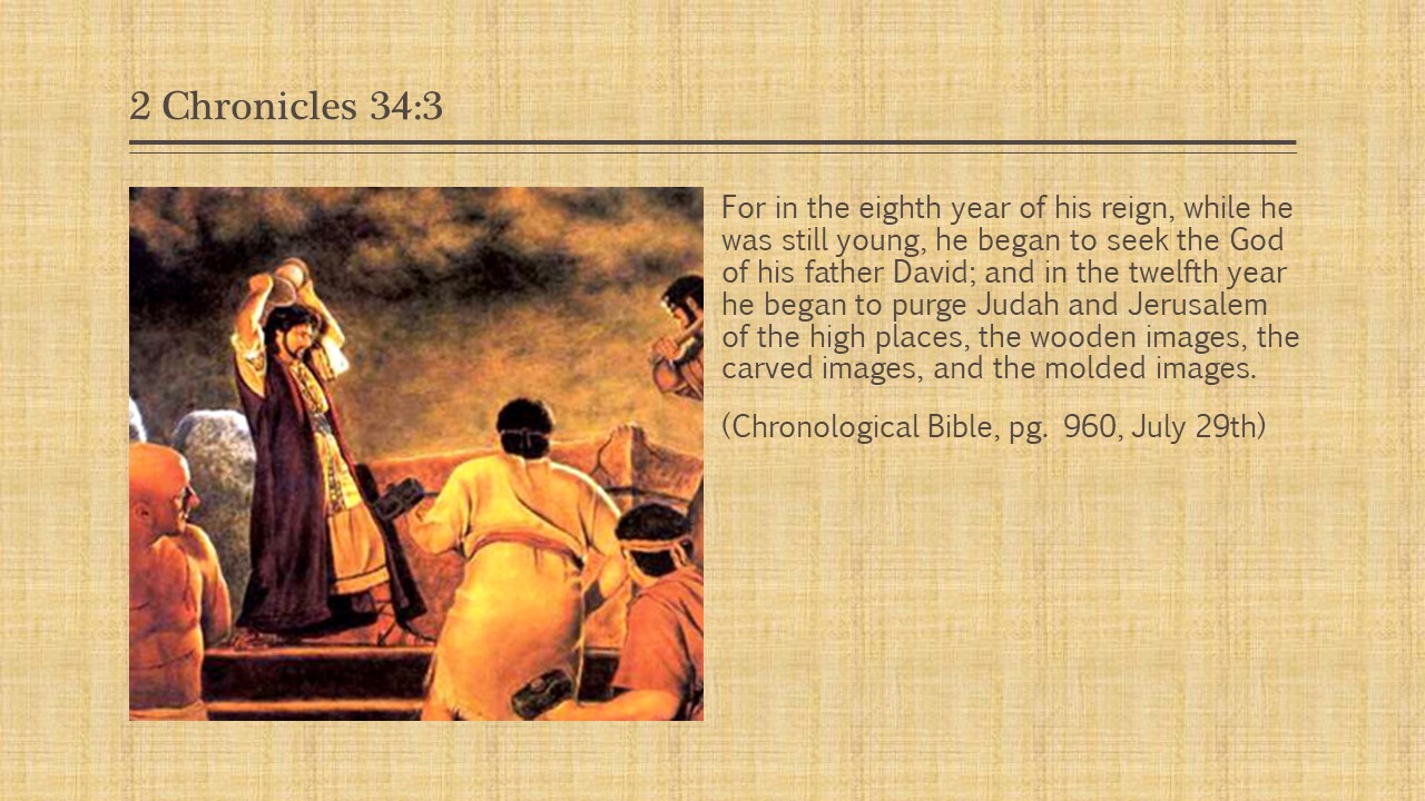 For in the eighth year of his reign, while he was still young, he began to seek the God of his father David; and in the twelfth year he began to purge Judah and Jerusalem of the high places, the wooden images, the carved images, and the molded images. (Chronological Bible, pg. 960, July 29th)