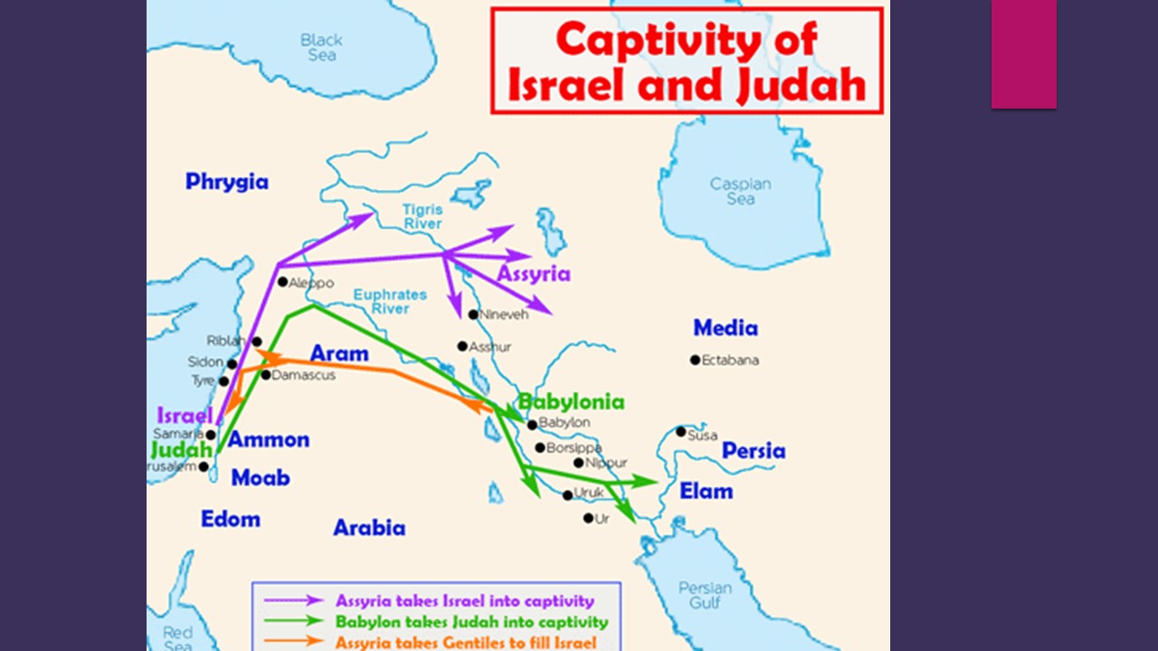 In 722 BC, the Assyrians arrive in Israel and drive the Israelites out. Then a few decades later, King Hezekiah, one of the good kings of Judah, brought the people back to worship the Lord, and God rescued Judah by killing 185,000 Assyrian soldiers in 2 Kings 19:35.
