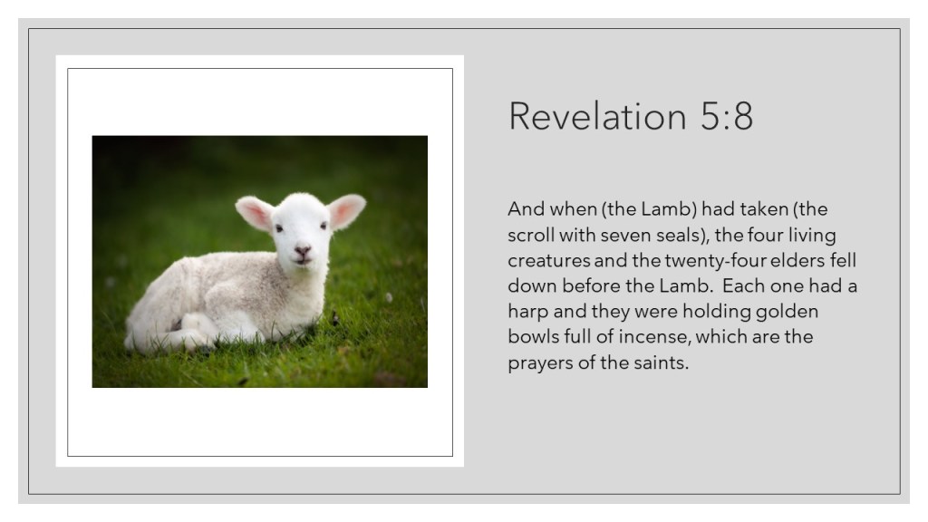 And when (the Lamb) had taken (the scroll with seven seals), the four living creatures and the twenty-four elders fell down before the Lamb. Each one had a harp and they were holding golden bowls full of incense, which are the prayers of the saints.