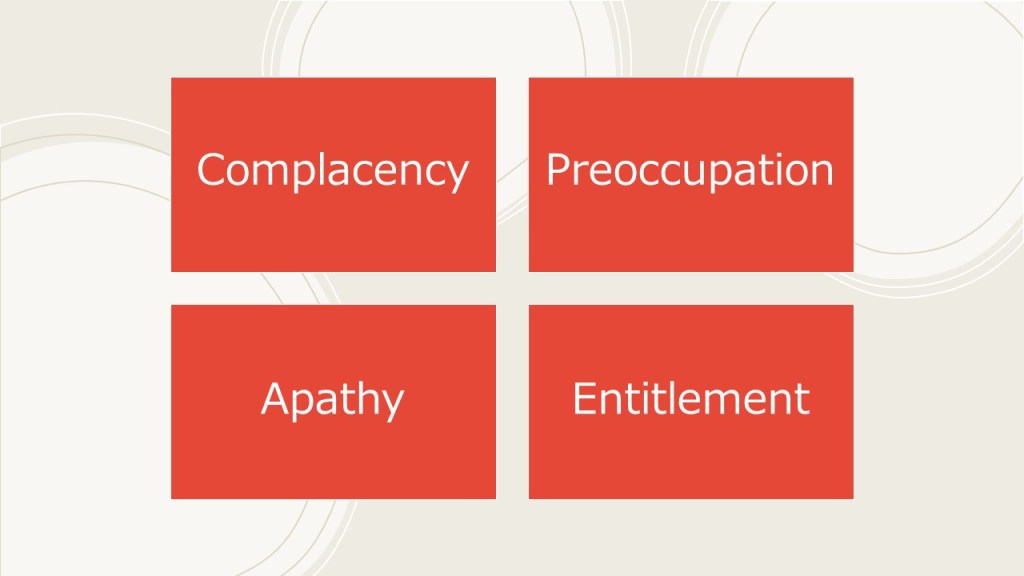 – Complacency. In Amos 6:1, Amos says