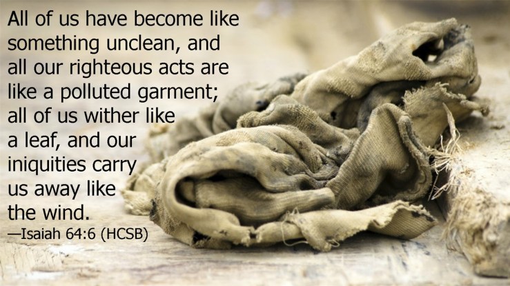 Sing in the choir? Filthy rag. Tithing 15% instead of 10%? Filthy rag. Perfect Sunday school attendance? Filthy rag. Being a Sunday school teacher? Filthy rag. We have all become unclean, we all wear filthy rags.