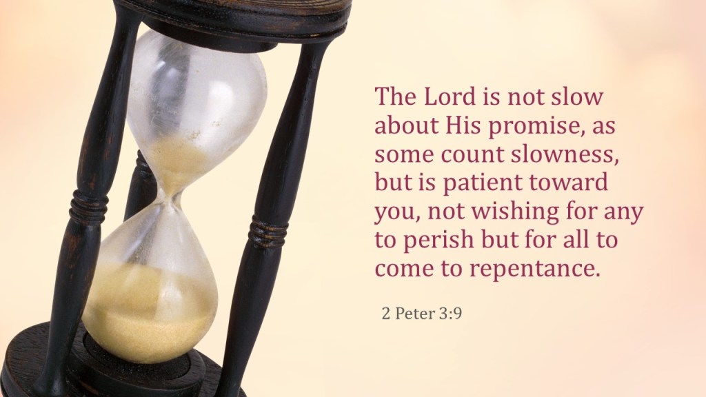 The Lord is not slow about His promise, as some count slowness, but is patient toward you, not wishing for any to perish but for all to come to repentance.