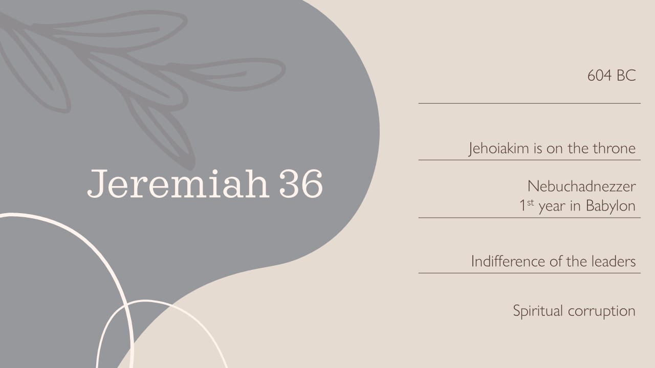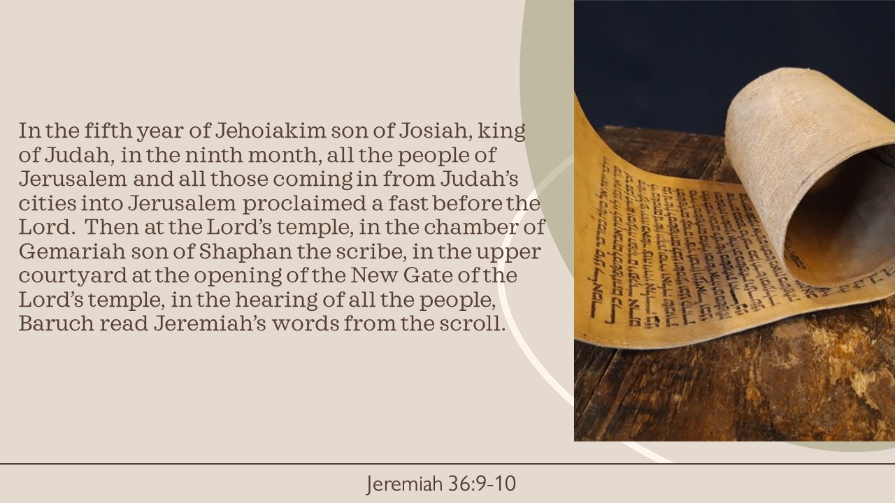 Some things have changed since my last lesson. For one thing, Jeremiah’s prophecy is beginning. In Babylon, Nebuchadnezzar is now on the throne. Worse, in Judah, King Jehoiakim is on the throne, a ruler characterized by corruption over a a nation plagued by spiritual decline. The fourth year of Jehoiakim’s rule witnessed an all-time low in the spiritual climate of Jerusalem and Judah as a whole. In the face of this adversity, Jeremiah, the faithful prophet of God, encountered strong resistance from both the king and the people. They went to great lengths to censor and ban Jeremiah from entering the Temple and the assembly. Remarkably, while Judah celebrated what Jeremiah condemned, and cherished what he disdained, God’s unwavering pursuit of His people was far from over.