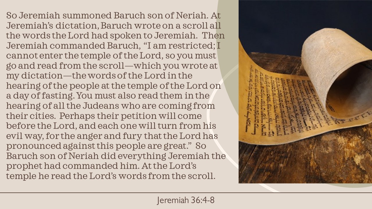 So Jeremiah summoned Baruch son of Neriah. At Jeremiah’s dictation, Baruch wrote on a scroll all the words the Lord had spoken to Jeremiah. Then Jeremiah commanded Baruch, “I am restricted; I cannot enter the temple of the Lord, so you must go and read from the scroll—which you wrote at my dictation—the words of the Lord in the hearing of the people at the temple of the Lord on a day of fasting. You must also read them in the hearing of all the Judeans who are coming from their cities. Perhaps their petition will come before the Lord, and each one will turn from his evil way, for the anger and fury that the Lord has pronounced against this people are great.” So Baruch son of Neriah did everything Jeremiah the prophet had commanded him. At the Lord’s temple he read the Lord’s words from the scroll.