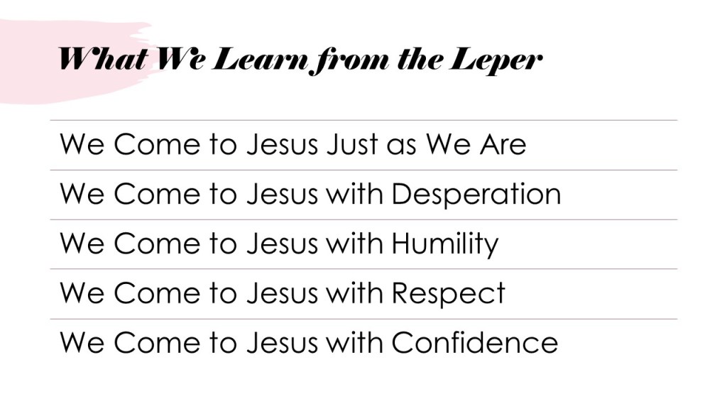 The leper served as a walking illustration of the human condition. We see an illustration of the power of sin over us and the power of Jesus over that sin. And we know that we can come to Jesus just as we are. We don’t clean ourselves up first, we come to Him and He cleans us.