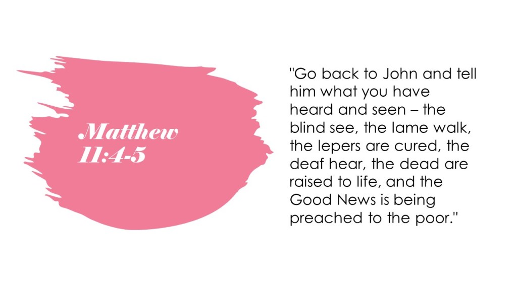 “Go back to John and tell him what you have heard and seen – the blind see, the lame walk, the lepers are cured, the deaf hear, the dead are raised to life, and the Good News is being preached to the poor.”