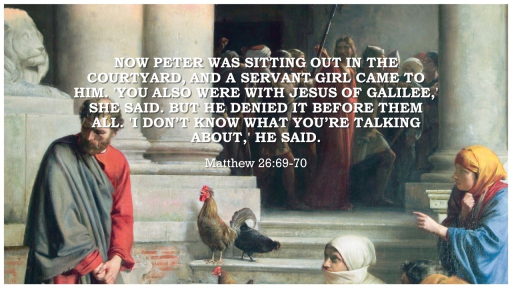 Now Peter was sitting out in the courtyard, and a servant girl came to him. ‘You also were with Jesus of Galilee,’ she said. But he denied it before them all. ‘I don’t know what you’re talking about,’ he said.