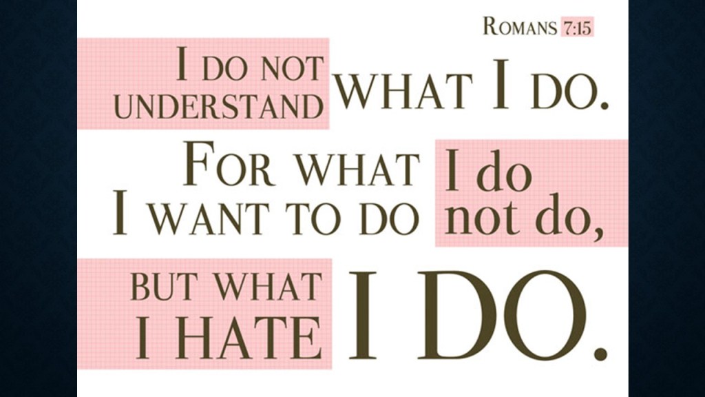 “For I do not understand my own actions. For I do not do what I want, but I do the very thing I hate. Now if I do what I do not want, I agree with the law, that it is good. So now it is no longer I who do it, but sin that dwells within me. For I know that nothing good dwells in me, that is, in my flesh. For I have the desire to do what is right, but not the ability to carry it out. For I do not do the good I want, but the evil I do not want is what I keep on doing.”