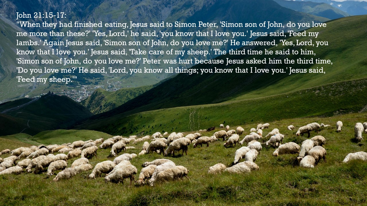 “When they had finished eating, Jesus said to Simon Peter, ‘Simon son of John, do you love me more than these?’ ‘Yes, Lord,’ he said, ‘you know that I love you.’ Jesus said, ‘Feed my lambs.’ Again Jesus said, ‘Simon son of John, do you love me?’ He answered, ‘Yes, Lord, you know that I love you.’ Jesus said, ‘Take care of my sheep.’ The third time he said to him, ‘Simon son of John, do you love me?’ Peter was hurt because Jesus asked him the third time, ‘Do you love me?’ He said, ‘Lord, you know all things; you know that I love you.’ Jesus said, ‘Feed my sheep.’”