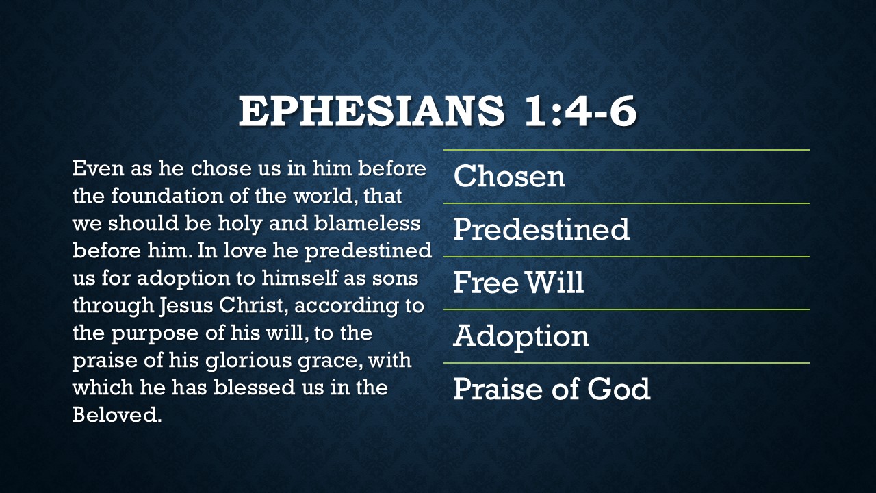Even as he chose us in him before the foundation of the world, that we should be holy and blameless before him. In love he predestined us for adoption to himself as sons through Jesus Christ, according to the purpose of his will, to the praise of his glorious grace, with which he has blessed us in the Beloved.