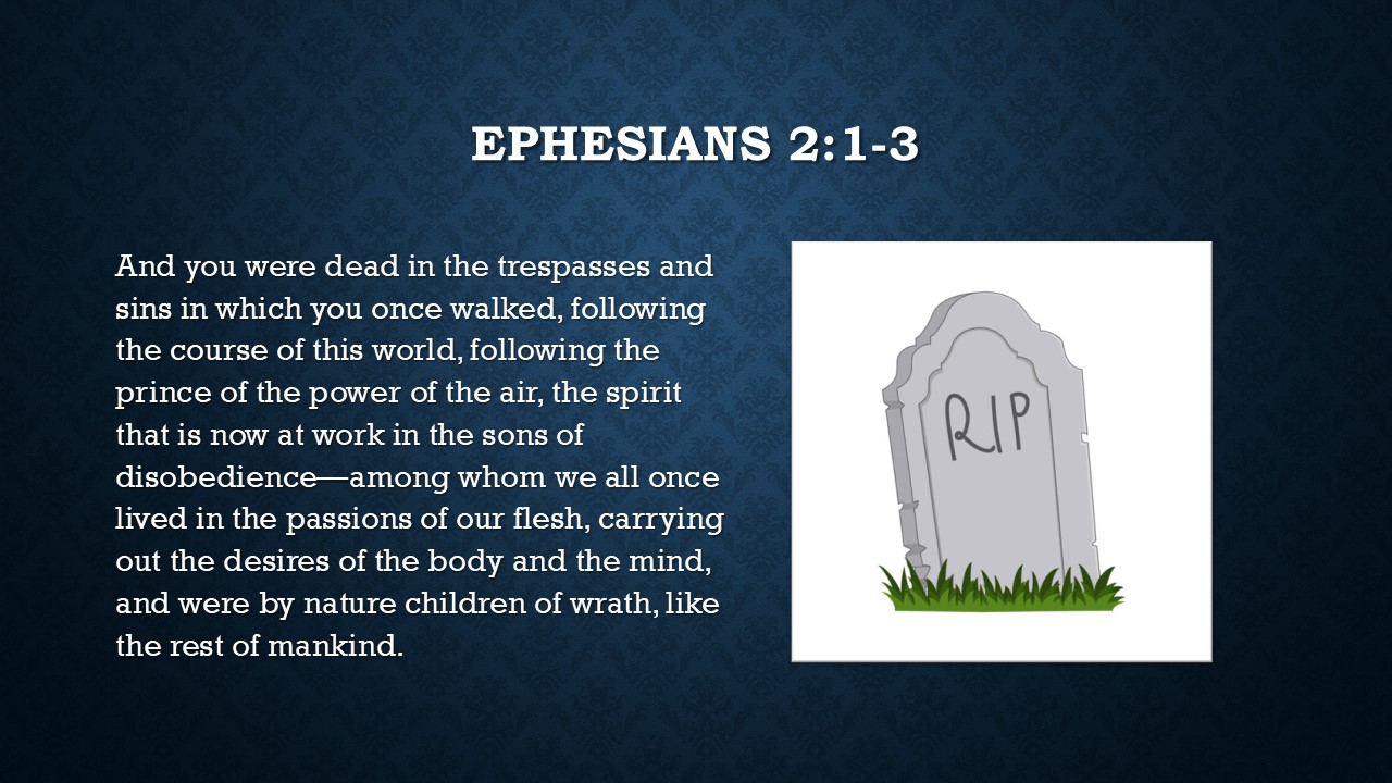And you were dead in the trespasses and sins in which you once walked, following the course of this world, following the prince of the power of the air, the spirit that is now at work in the sons of disobedience—among whom we all once lived in the passions of our flesh, carrying out the desires of the body and the mind, and were by nature children of wrath, like the rest of mankind.