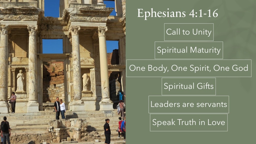 In this passage, Paul challenges believers to live worthy of their calling by maintaining unity and using their gifts. We’ll break the text into three parts: the call to unity (Ephesians 4:1-6), the gifts given by Christ (Ephesians 4:7-13), and the goal of maturity (Ephesians 4:14-16).