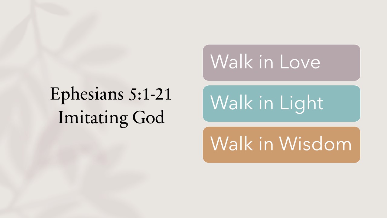 Ephesians 5:1-21 calls for us to live in a way that mirrors God’s character and embodies the transformation that comes from faith in Christ. Paul’s previous instructions were on unity and maturity within the body of Christ, but now Paul shifts focus, urging the church to pursue a lifestyle distinct from the immorality that pervades their cultural environment. At the heart of this passage are three commands: to “walk in love,” “walk as children of light,” and “walk in wisdom.” Each instruction represents a facet of what it means to “imitate God” as His beloved children.