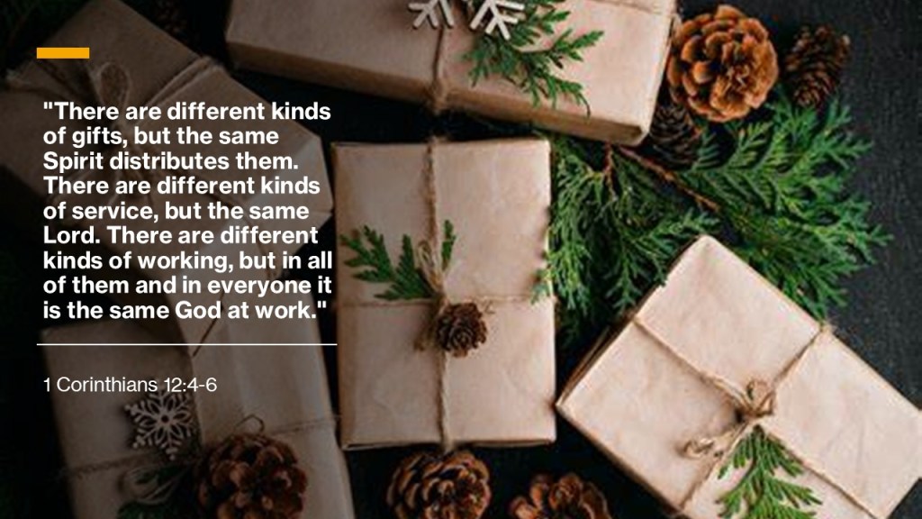 “There are different kinds of gifts, but the same Spirit distributes them. There are different kinds of service, but the same Lord. There are different kinds of working, but in all of them and in everyone it is the same God at work.”