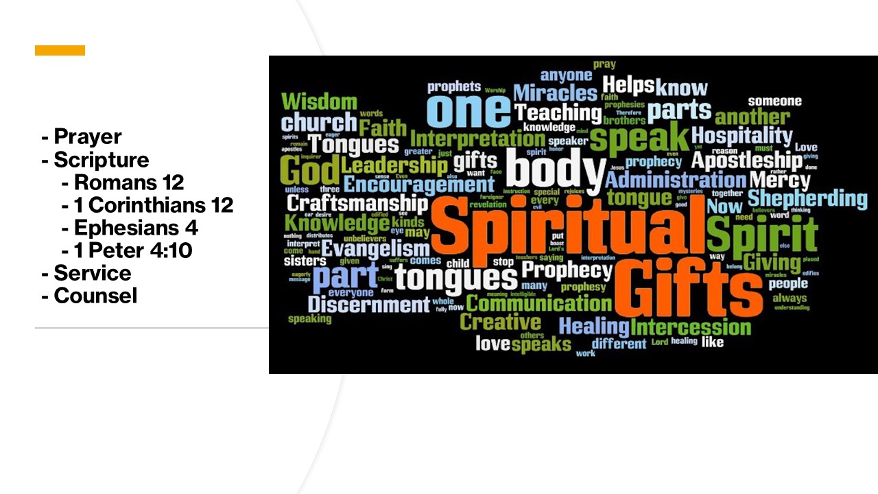 - Scripture: Study what the Bible says about spiritual gifts (Romans 12, 1 Corinthians 12, Ephesians 4).