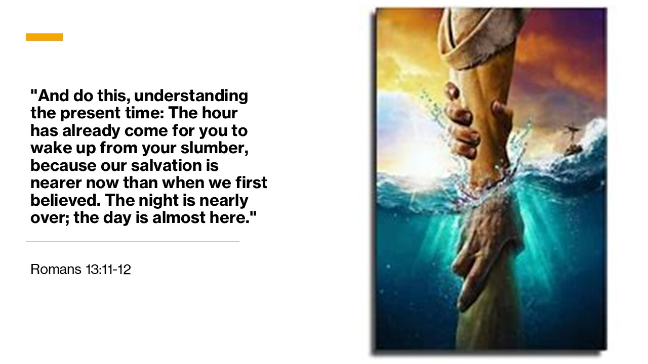 “And do this, understanding the present time: The hour has already come for you to wake up from your slumber, because our salvation is nearer now than when we first believed. The night is nearly over; the day is almost here.”