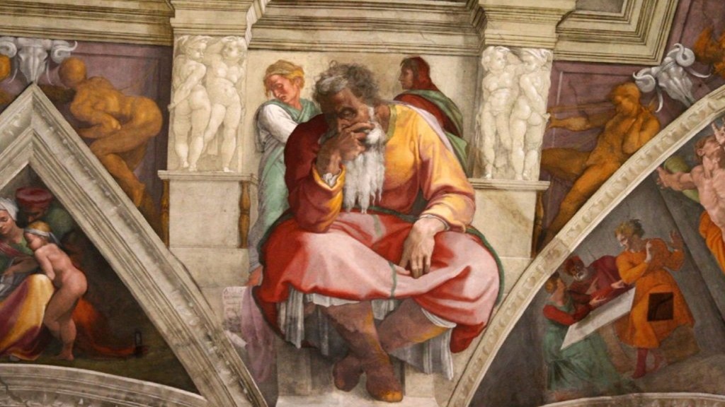On the Sistine Chapel, Michelangelo painted seven prophets, and here is a closeup of Jeremiah. In Philip Graham Ryken’s book on Jeremiah, Ryken described the painting this way –