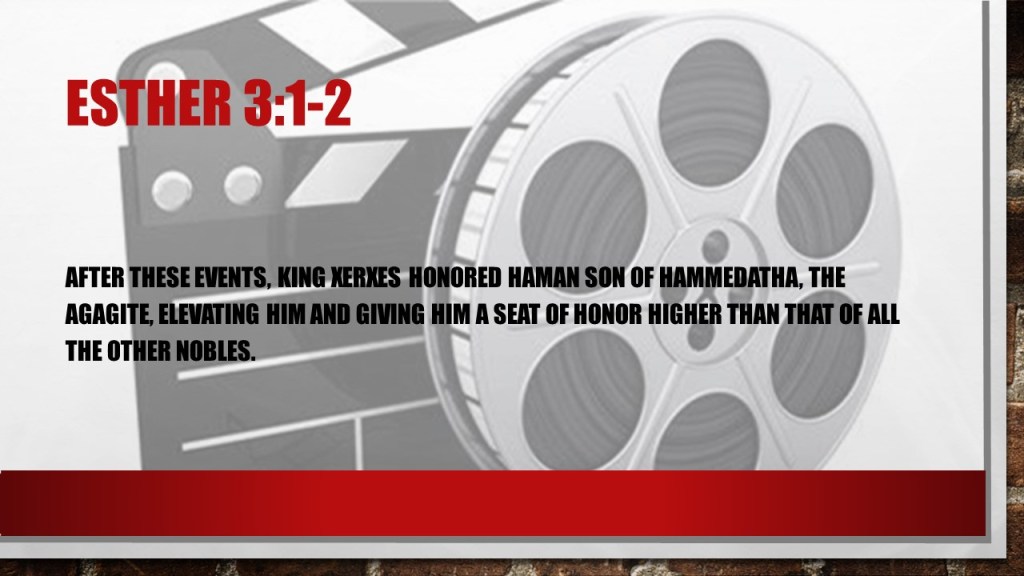 And it’s worth noting: that phrase “after these events” may cover a significant span of time. Esther has been queen for a while when Haman rises to power. This isn’t necessarily the next day. But the camera cuts from Mordecai saving the king in Chapter 2 to Haman being elevated in Chapter 3—and you can feel something ominous coming.