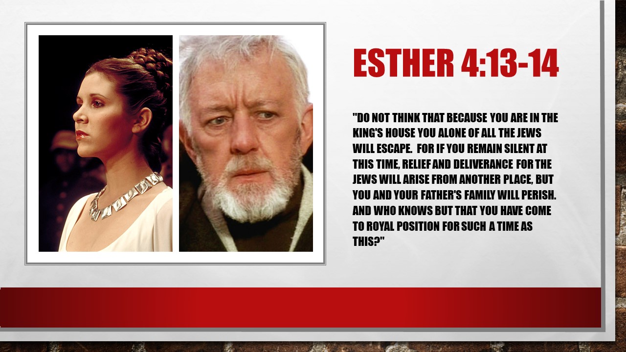 “Do not think that because you are in the king’s house you alone of all the Jews will escape. For if you remain silent at this time, relief and deliverance for the Jews will arise from another place, but you and your father’s family will perish. And who knows but that you have come to royal position for such a time as this?”