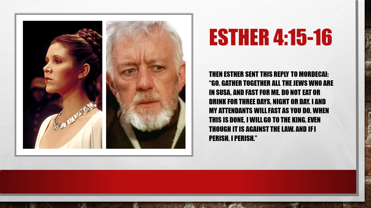 Mordecai delivers at this point one of the most memorable lines of the bible. He tells Esther that deliverance will come—God will accomplish His purpose. Silence isn’t neutral here. If Esther will not do it, then God will save His chosen people another way. Esther’s choice is whether she is going to participate in God’s plan and realize that her entire being, her beauty and position, was orchestrated by God, and God will accomplish His will through His obedient people. Mordecai also tells her that if she’s trying to save her own skin, she’s probably going to lose that, too. She’s a Jew – if the Jews are eliminated, that includes her. She cannot save her own life. All she can do is choose to be obedient, or not. Mordecai says in verse 13-14,