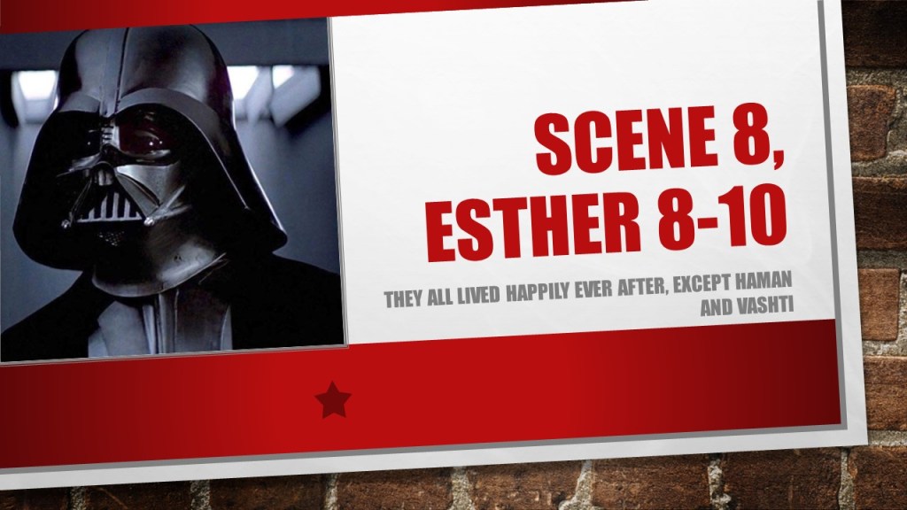 Scene 8, they all lived happily ever after. The king gave Esther everything that Haman owned, Mordecai was given a place in the palace, and the authority of the empire shifted. Remember that signet ring? The ring that made Haman’s decree unstoppable? Xerxes takes it off Haman’s hand and gives it to Mordecai. The symbol of power changes hands, and the story’s reversal is now official.