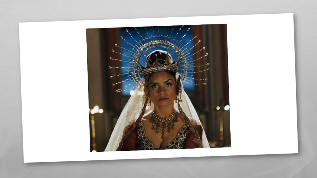 After a full year of beauty treatments, she’s taken to King Xerxes, who likes what he sees. Xerxes says, “Hey, attendant-guy, whatever your name is. Get this girl a crown.”