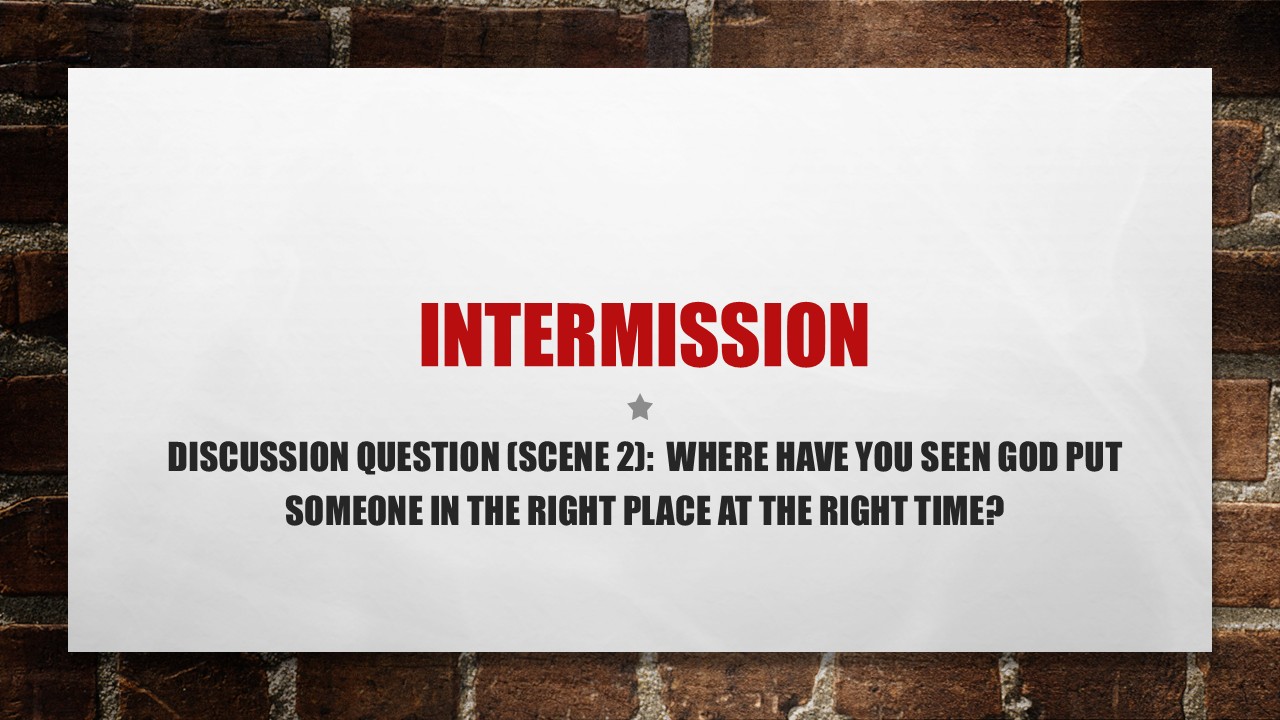 Discussion Question (Scene 2): Where have you seen God put someone in the right place at the right time?