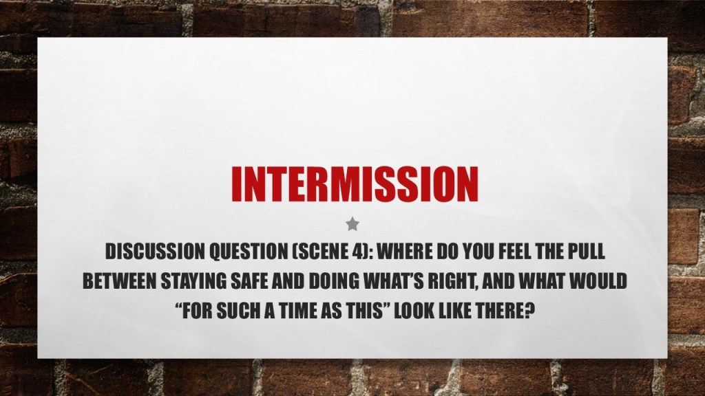 Discussion Question (Scene 4): Where do you feel the pull between staying safe and doing what’s right, and what would “for such a time as this” look like there?
