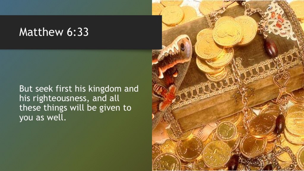 This response reminds me of God’s promises to us. Are we to seek fame or fortune, wealth or power? In Matthew 6, Jesus provides a lot of information on how to live our lives – without worry, don’t brag, give to the needy, don’t store up treasures on earth – but then in Matthew 6:33, Jesus says,