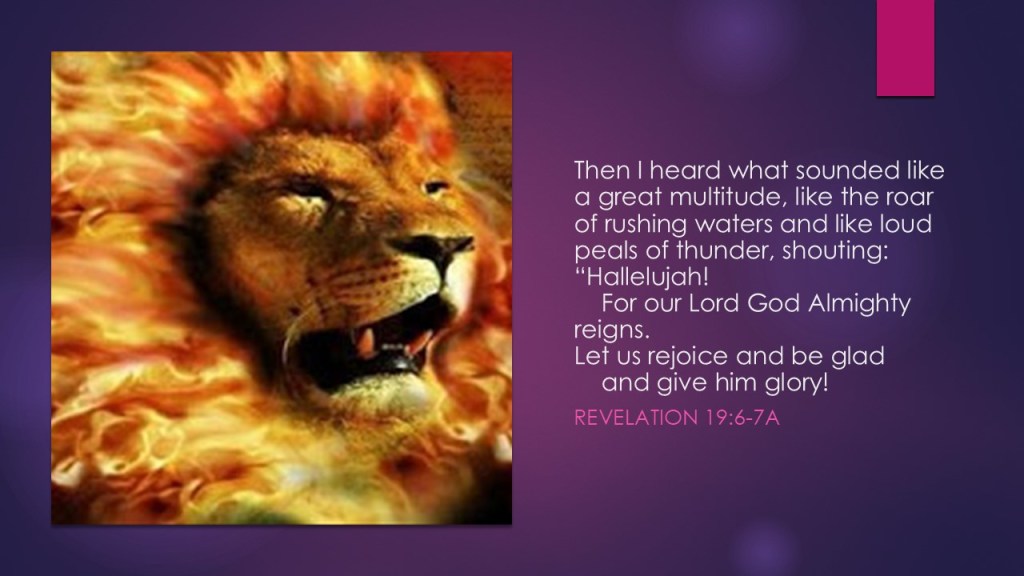 and like loud peals of thunder, shouting: “Hallelujah! For our Lord God Almighty reigns. Let us rejoice and be glad and give him glory!”