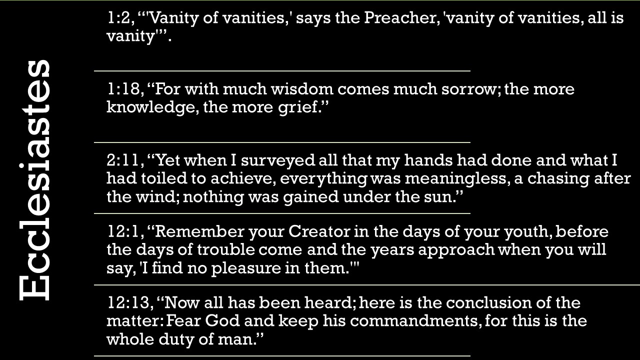 Ecclesiastes is a unique book. Most think it was written by Solomon near the end of his life, and it’s a book of perspectives and of insights about the purpose of life. It’s a book of depression as Solomon tries to find pleasure in this world, only to find that eternal pleasure in this temporary, human world is not possible. Nothing gives him meaning, everything is like chasing after the wind.